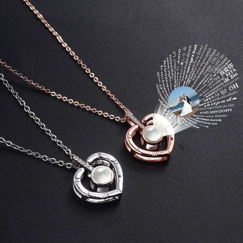 Personalized heart photo projection necklace with i love you in 100 languages.